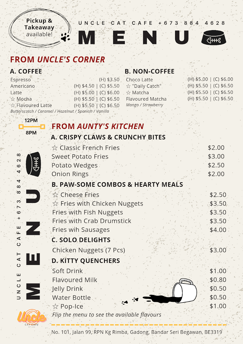 The menu at Uncle Cat Cafe offers a delicious selection of drinks from Uncle's Corner. Treat yourself to an Espresso for just BND 3.50, or indulge in a rich Latte for BND 5.00. If you’re in the mood for something different, don’t miss the Flavoured Lattes, available in delightful varieties such as Butterscotch, Hazelnut, and Vanilla—all at BND 5.50. For lovers of sweet treats, the Choco Latte and Daily Catch (both at BND 5.50) are sure to satisfy your cravings.